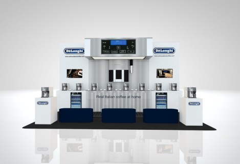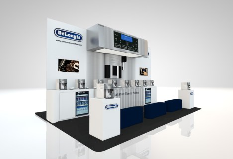 To create a statement at the BBC Good Food Show, De’Longhi wanted to create an over-sized model of their Prima Donna 6700 coffee machine as the basis of their stand. The main body of the coffee machine made up the demonstration and storage areas with a backlit canopy to represent the coffee machine screen.